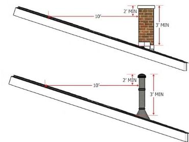Chimneys must protrude at least 3 feet from where breaching the roofline; chimney height must be a minimum of 2 feet taller than the tallest point within a 10 foot radius. Chimney crowns must facilitate a drip edge. Spark arresting chimney caps are required.